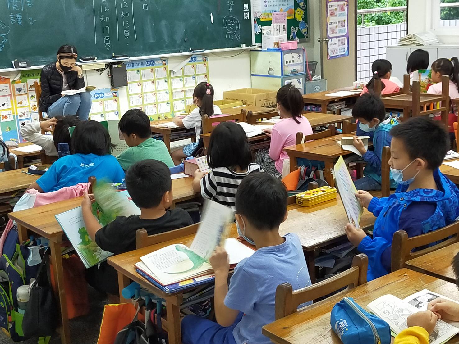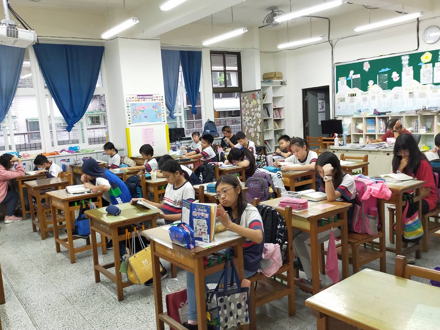 每週一、四早晨進行20分鐘身教式寧靜閱讀,閱讀材料從班級訂閱的國語日報、班級書箱、英語書箱以及從圖書館借閱的書籍等。