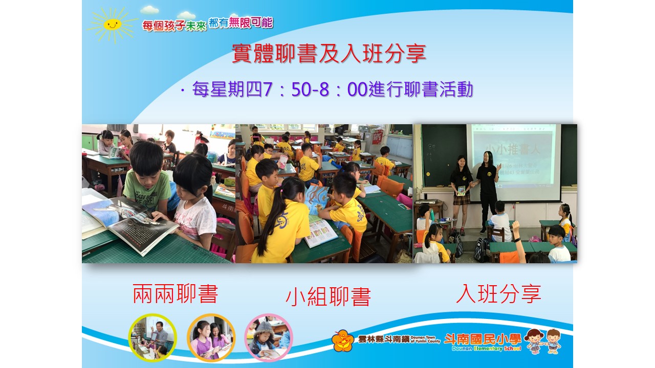 三、每週四進行一次班級的實體聊書,由兩兩聊書開始再發展小組、全班聊書。