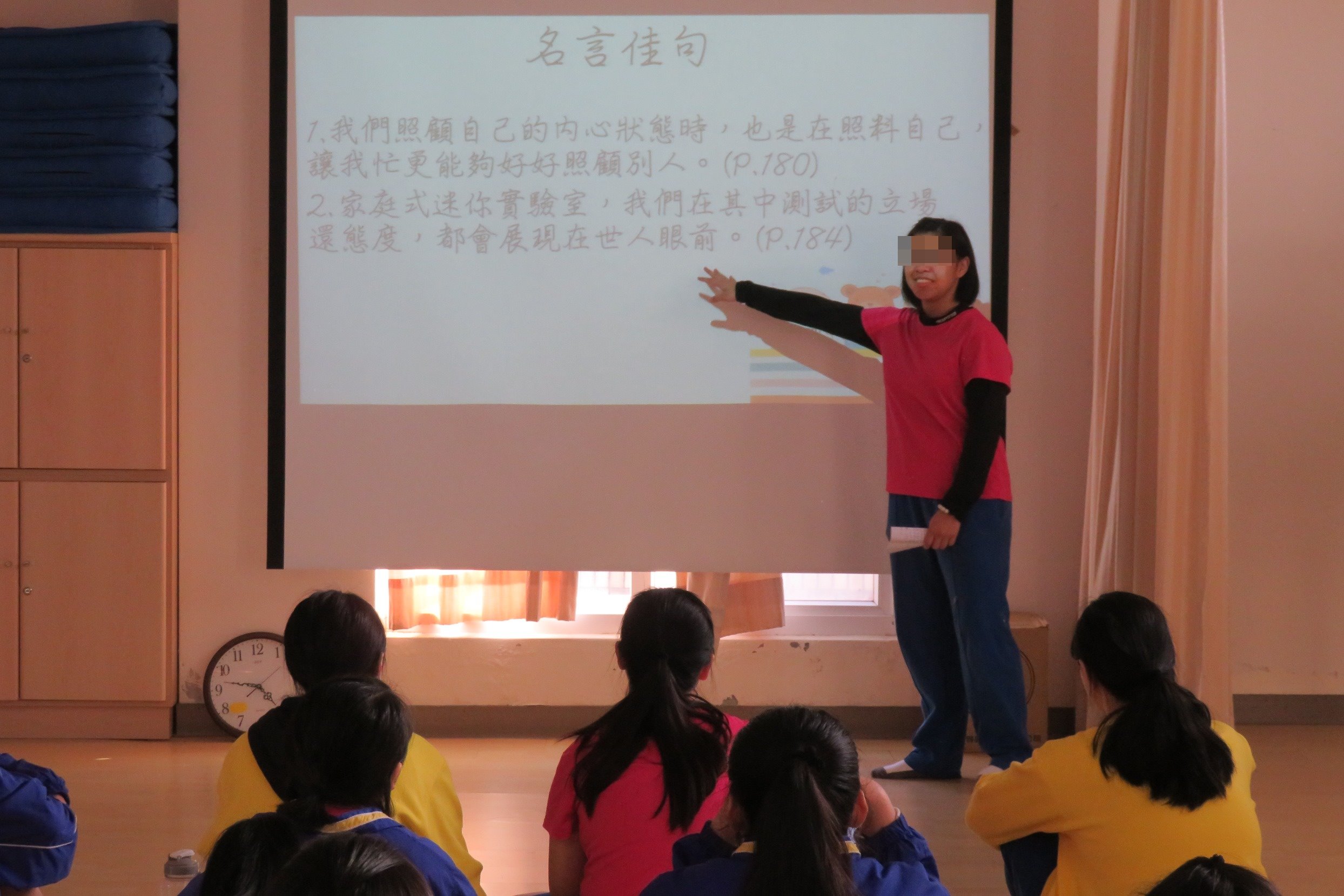 三、暮鼓晨鐘:每週星期三早晨安排全校所有學生聆聽一篇文章,從文章中的哲理故事中獲得啟發。老師先給予學生文章中的生字或難辭,學生在聆聽的過程中記錄文章的重要內容以及心得,在晨會時老師會再次引導學生回顧文章、探討意涵,透過正向經驗分享改善人生價值觀。