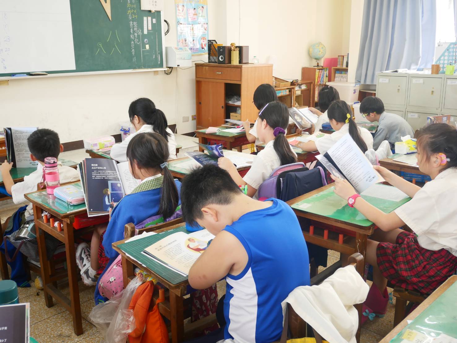 訂定閱讀推動計畫,安排各學年共讀書箱,將每週三晨光時間訂為全校共讀時間,進行MSSR閱讀。