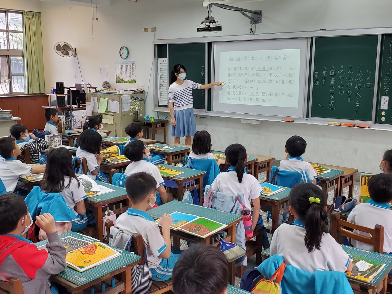 一、低年級老師使用愛的書庫書箱進行共讀與引導,老師會特別設計PPT,第一周帶領學生晨讀,第二周由提問引導學生深入了解故事書內容並進行聊書。