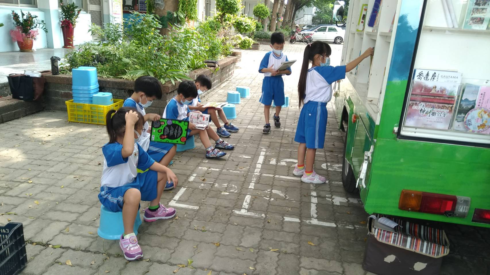 4.110學年度起申請員林佛光山雲水書車到校設站,每月1次(周五上午)書車到校由海鷗叔叔及志工帶領學生共同閱讀。