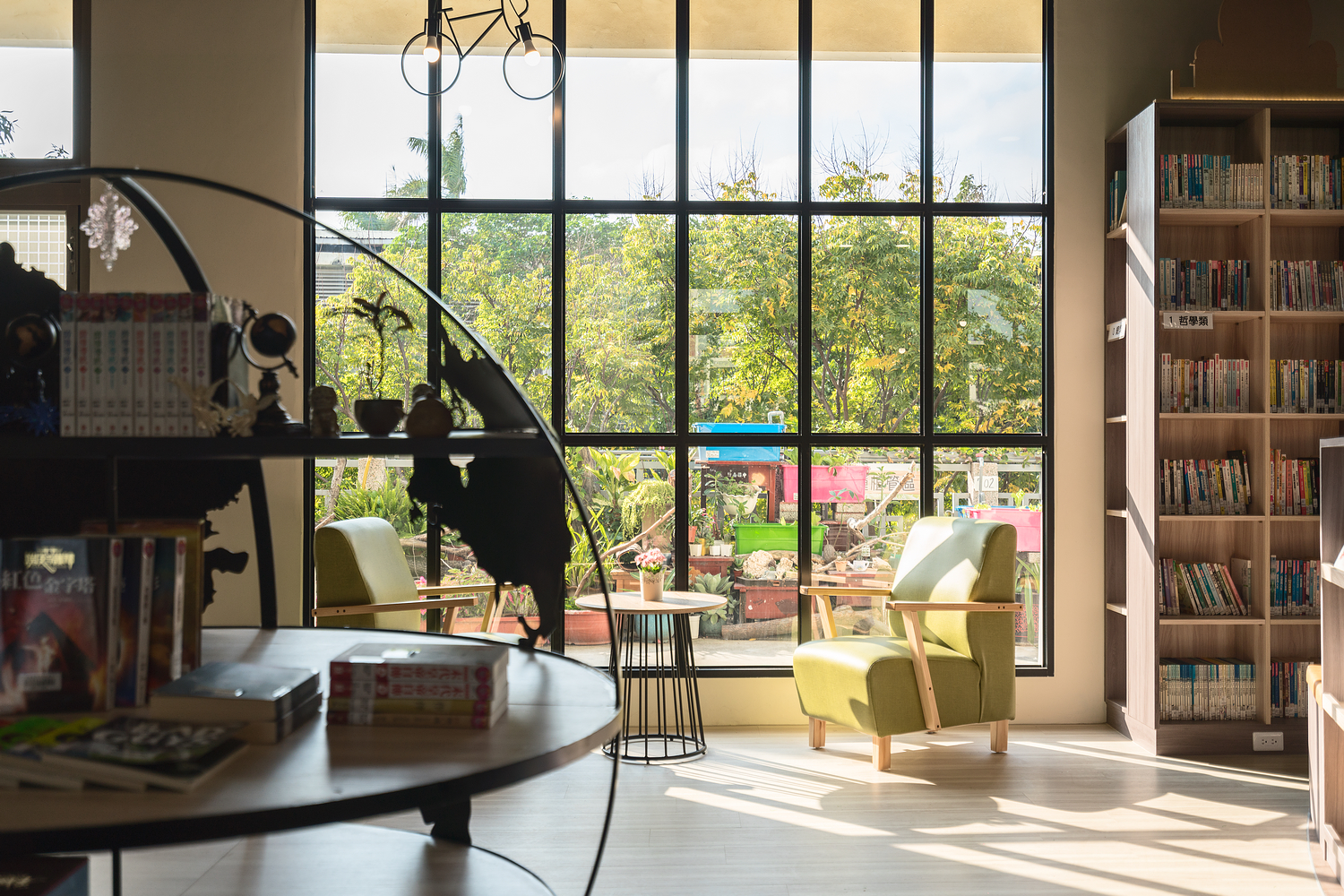 大面落地窗\沙發區:以落地大面窗透視外陽台的魚菜共生池,由本校的「創意自然」課程師生共同打造,窗前的沙發區讓讀者感受到在綠意中閱讀的美好。