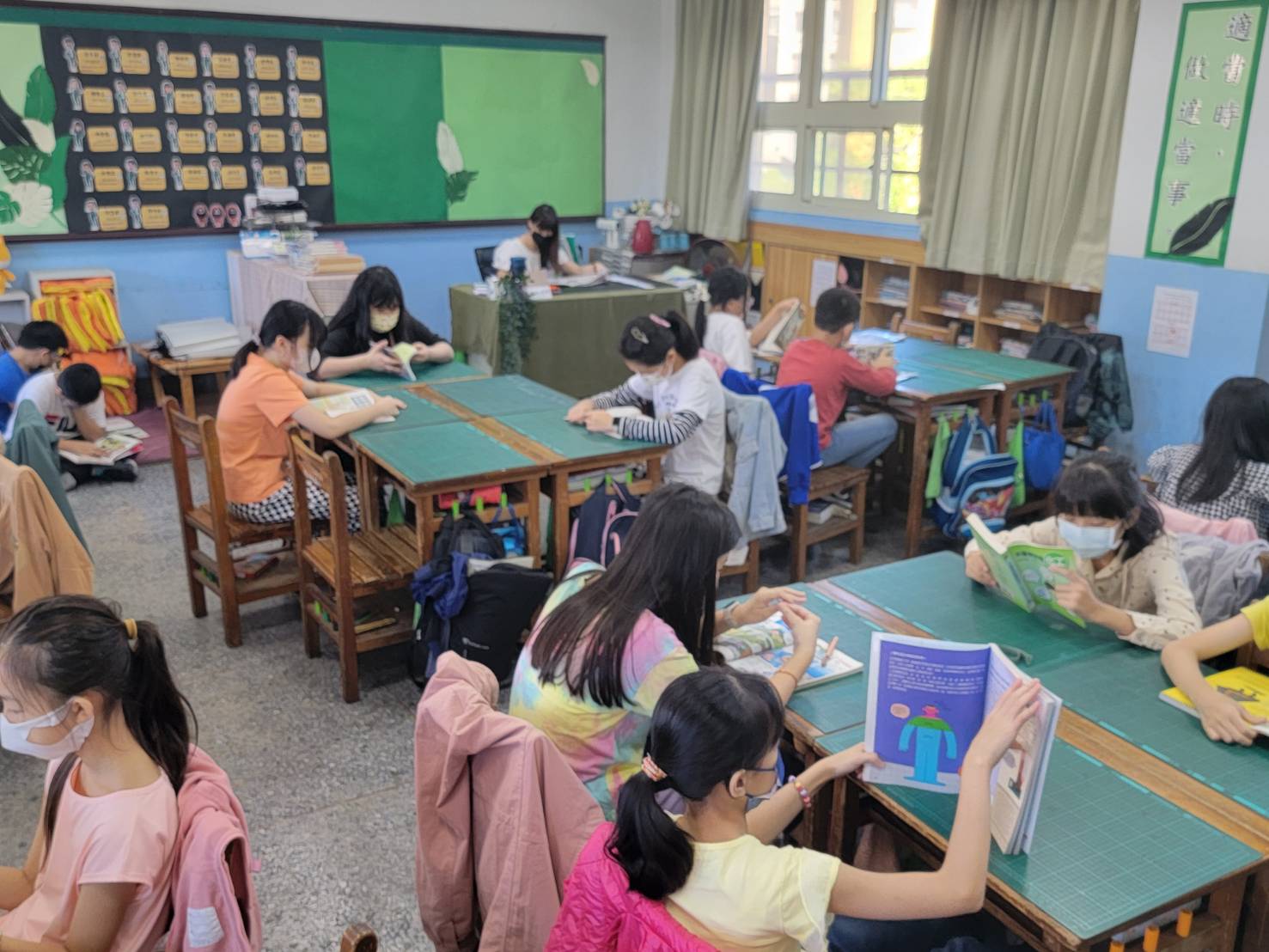 每週五晨間是班級進行書箱共讀的時間,以身教式持續安靜閱讀的方式,老師為學生的模範,潛移默化讓也學生喜歡閱讀,是學校閱讀推展的重要關鍵。
