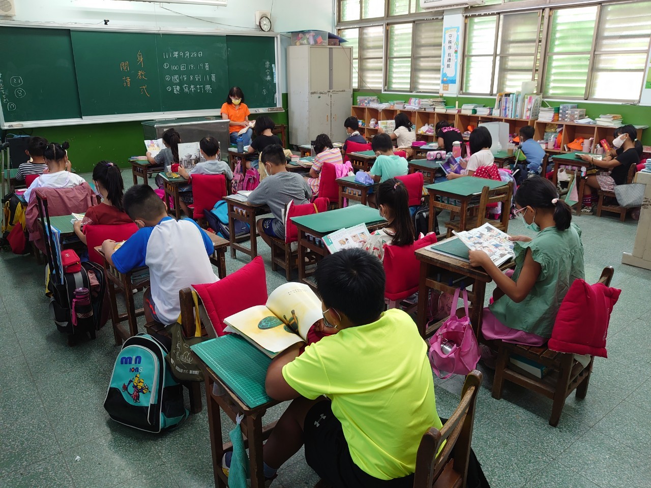 2、導師在身教式閱讀時間以身作則,與學童一同拿起書本,在晨間微風徐徐、蟲鳴鳥叫的校園環境裡,細細體會、慢慢品味閱讀的美好。