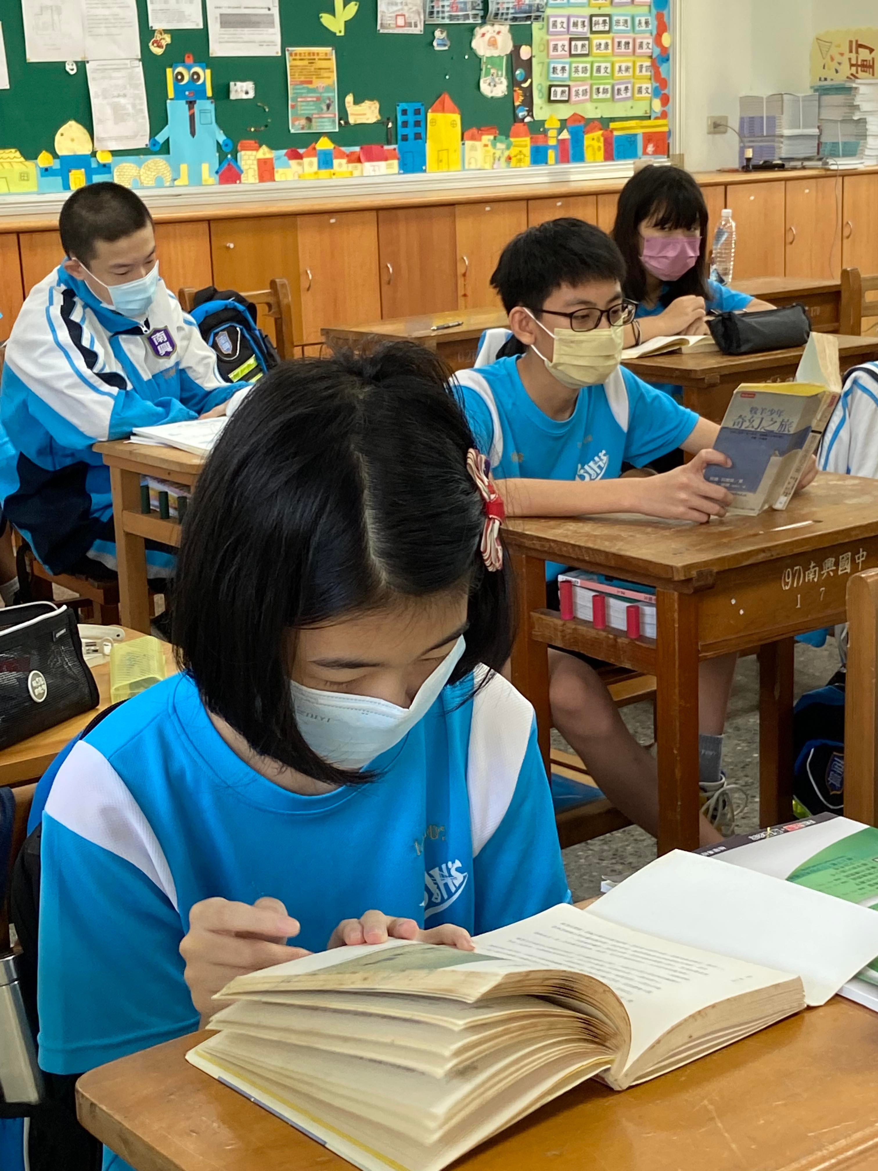 本校每周一早自習時間進行南興晨讀好時光,晨讀時有採自由閱讀課外書籍,或進行跨域雜誌閱讀,依108課綱,我們將各領域及議題融入晨讀,培養良好的閱讀習慣。由教務處、學務處及輔導室精選圖書館優良雜誌,包含幼獅少年、科學少年、少年台灣、國家地理、小牛頓、地球公民、哥白尼、Wapiti、經典、自然保育雜誌,藉由閱讀推動海洋教育、科學教育、人文素養教育、史地人文素養,藉由閱讀與分享,達到潛移默化的學習,協助學生自我成長。在全校會議及公佈欄上,宣導MRRS晨讀活動。再搭配由圖推教師精選的TED演講,透過聆聽演講、閱讀講稿,期許藉由演講者生命經驗的分享,潛移默化影響學生看待世界的眼光,使學生反思自己的行為,進而提升對自我的期待與價值感。。七、八年級運用閱讀寫作課,透過共讀書箱進行閱讀策略的運用、人生哲學的反思、心靈雞湯的洗禮,進而產出心得短文、書籤、小書等作品。
