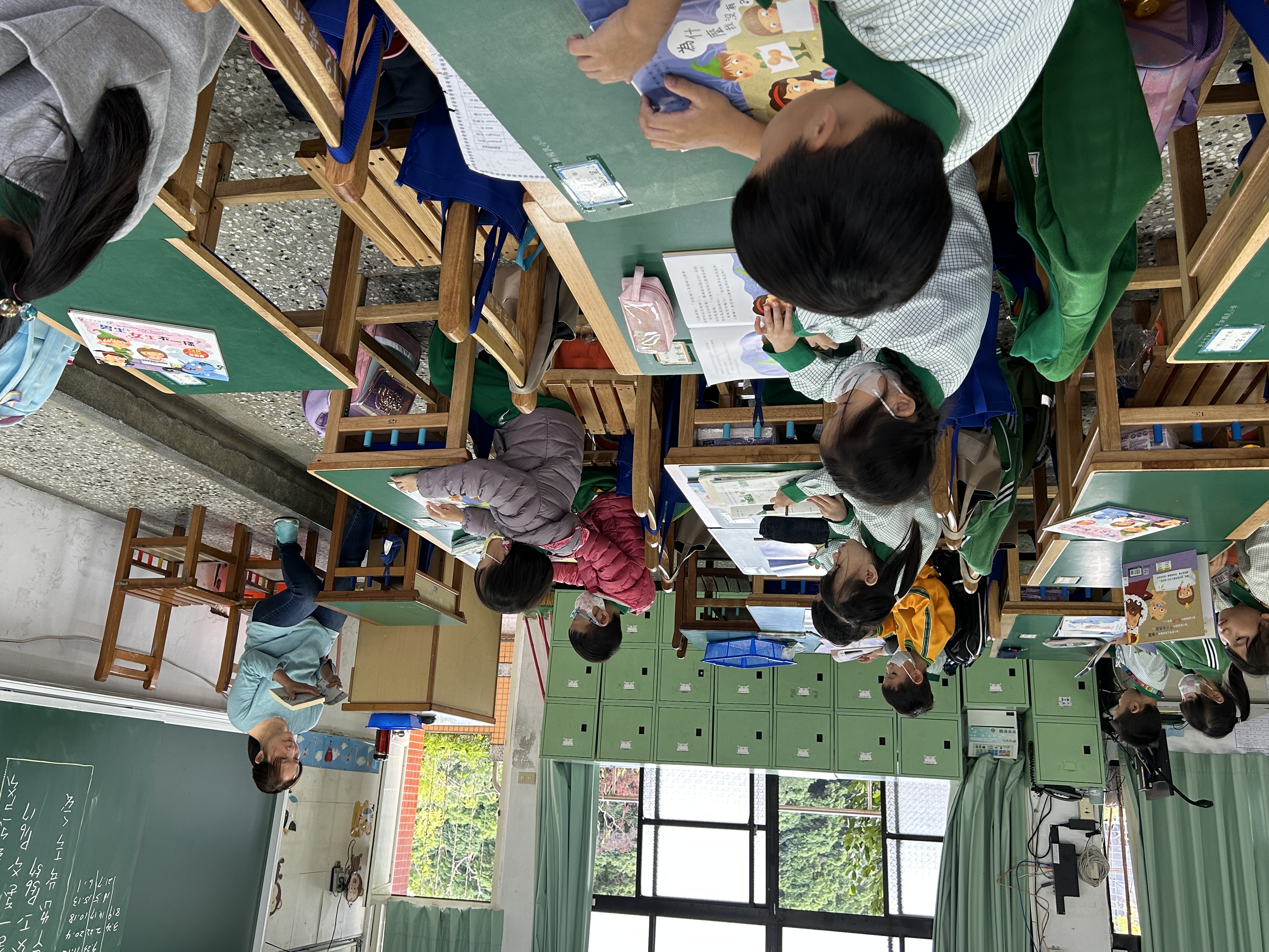 1.低年級老師以繪本或大書為主,引導學生聆聽故事內容,並用豐富的肢體動作或角色扮演讓學生進入故事情境。