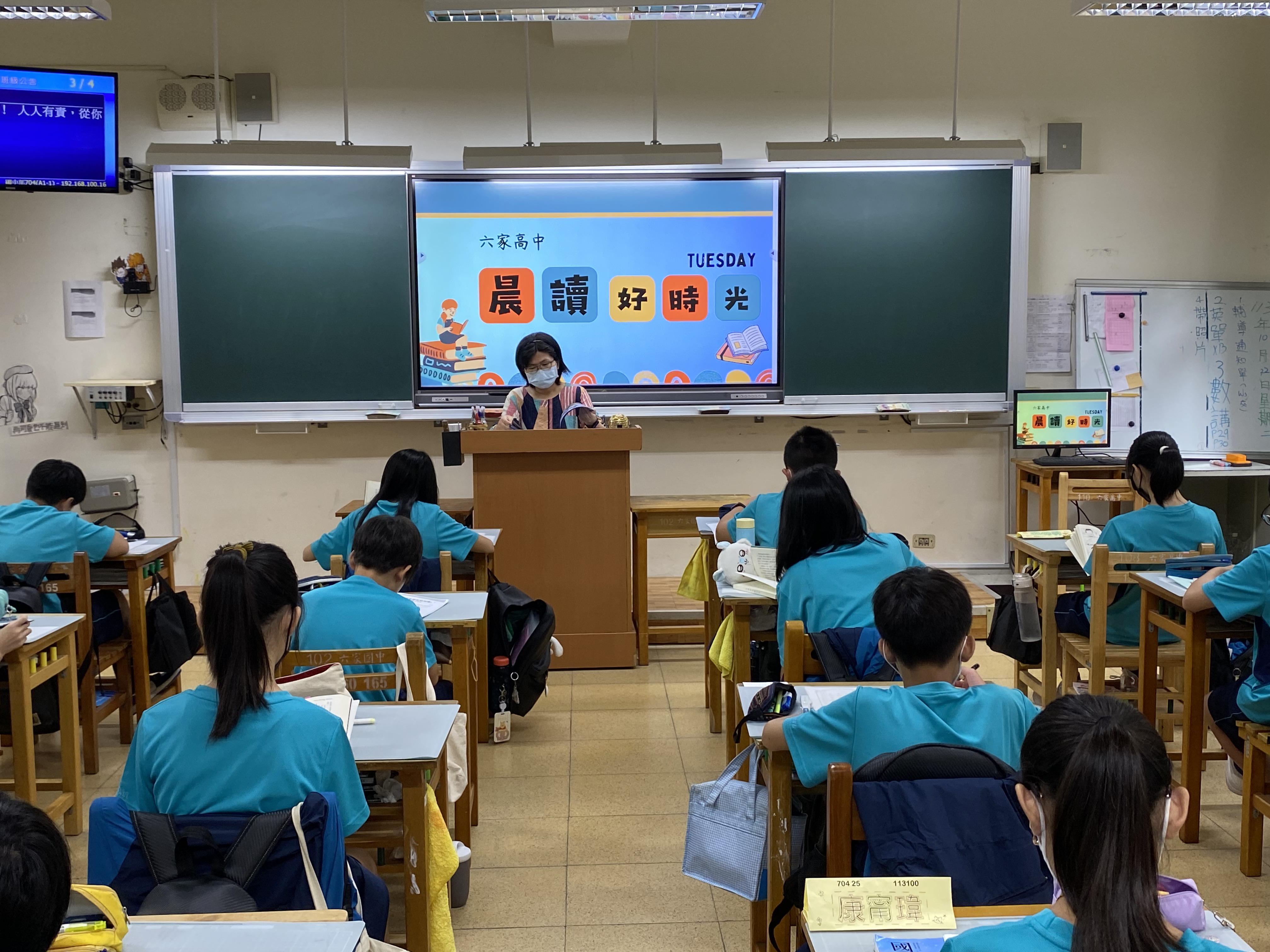 每週二7:30-8:00是國中部的晨讀時間,七年級閱讀好書+晨讀手冊、八年級則是讀報。為了讓高中部的學生亦能享受美好的晨讀時光,圖書館邀請部分班級試行。晨讀時間邀請圖書館志工家長、導師、各處室主任及校長,入班陪讀,進行MSSR。圖書股長協助播放音樂,親、師、生一同享受安靜悅讀的好時光。