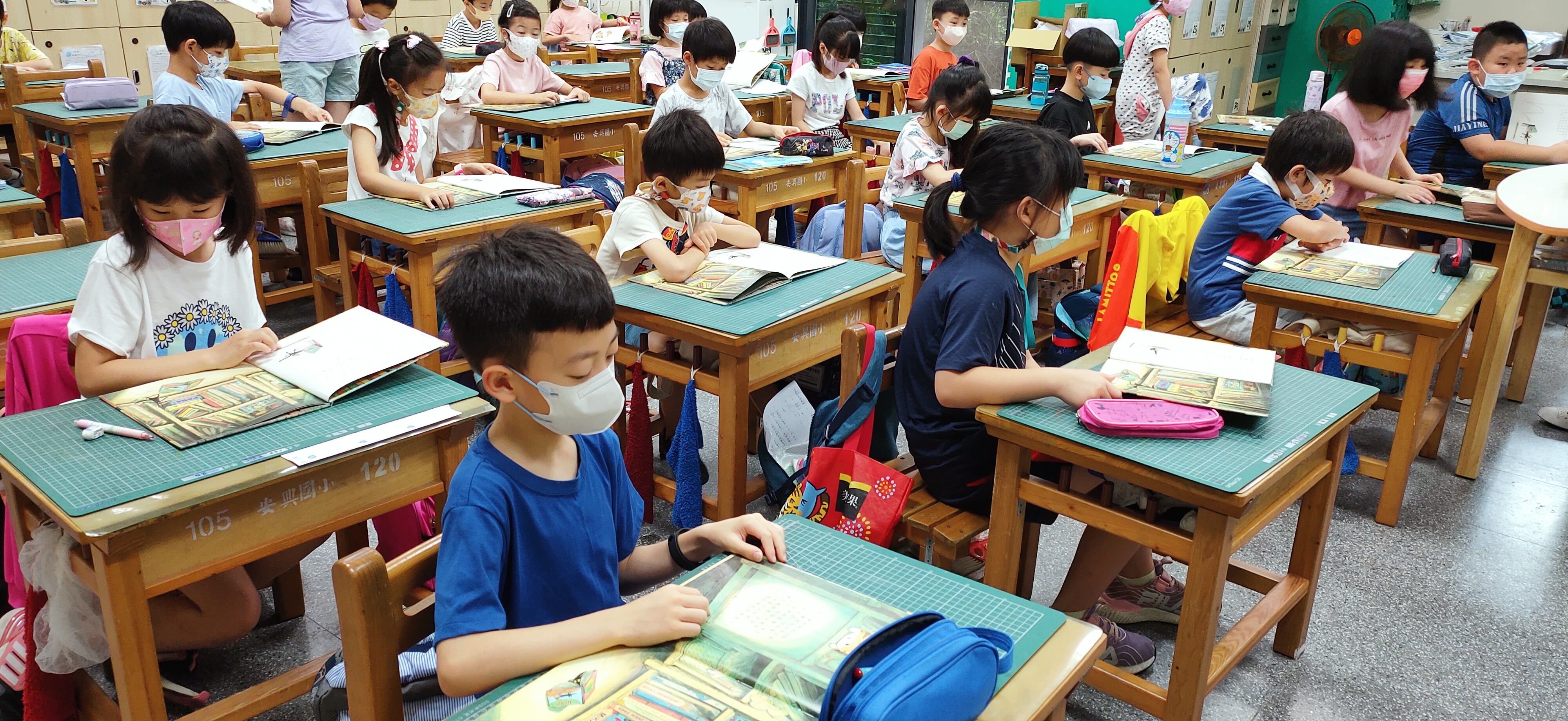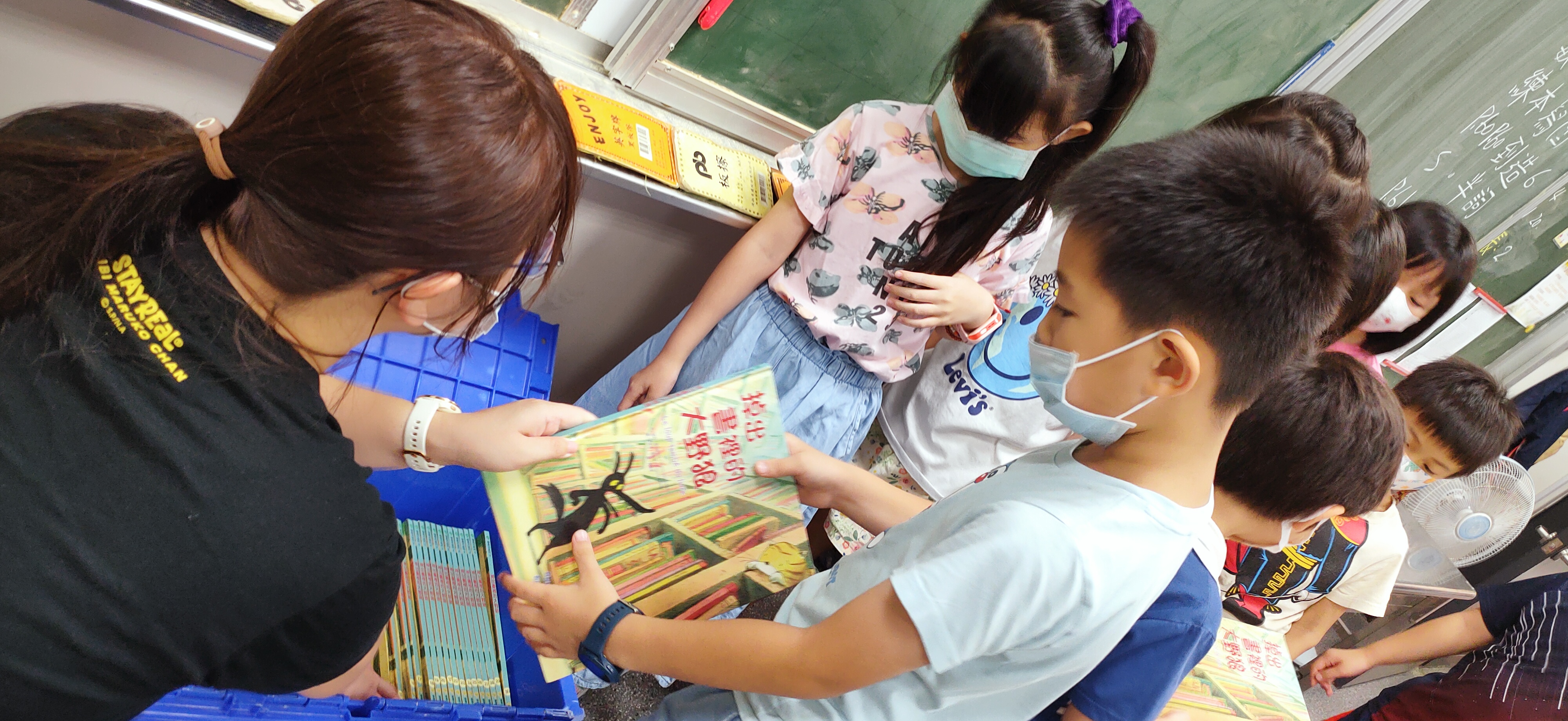 提供全校班級共讀書箱,每班2箱中文書籍,利於全班共讀聊書。每周將書箱傳至下一個班級,校園處處充滿書香。