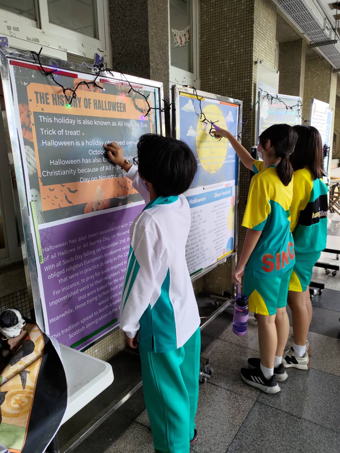 結合各國節慶的文化特色,學校設計了萬聖節閱讀展覽 ,在教務處外精心布置萬聖節擺飾,「不給糖就搗蛋;讀文本就給糖」的活動,吸引大量經過的同學們停下腳步,細細品讀各國鬼節的異同。