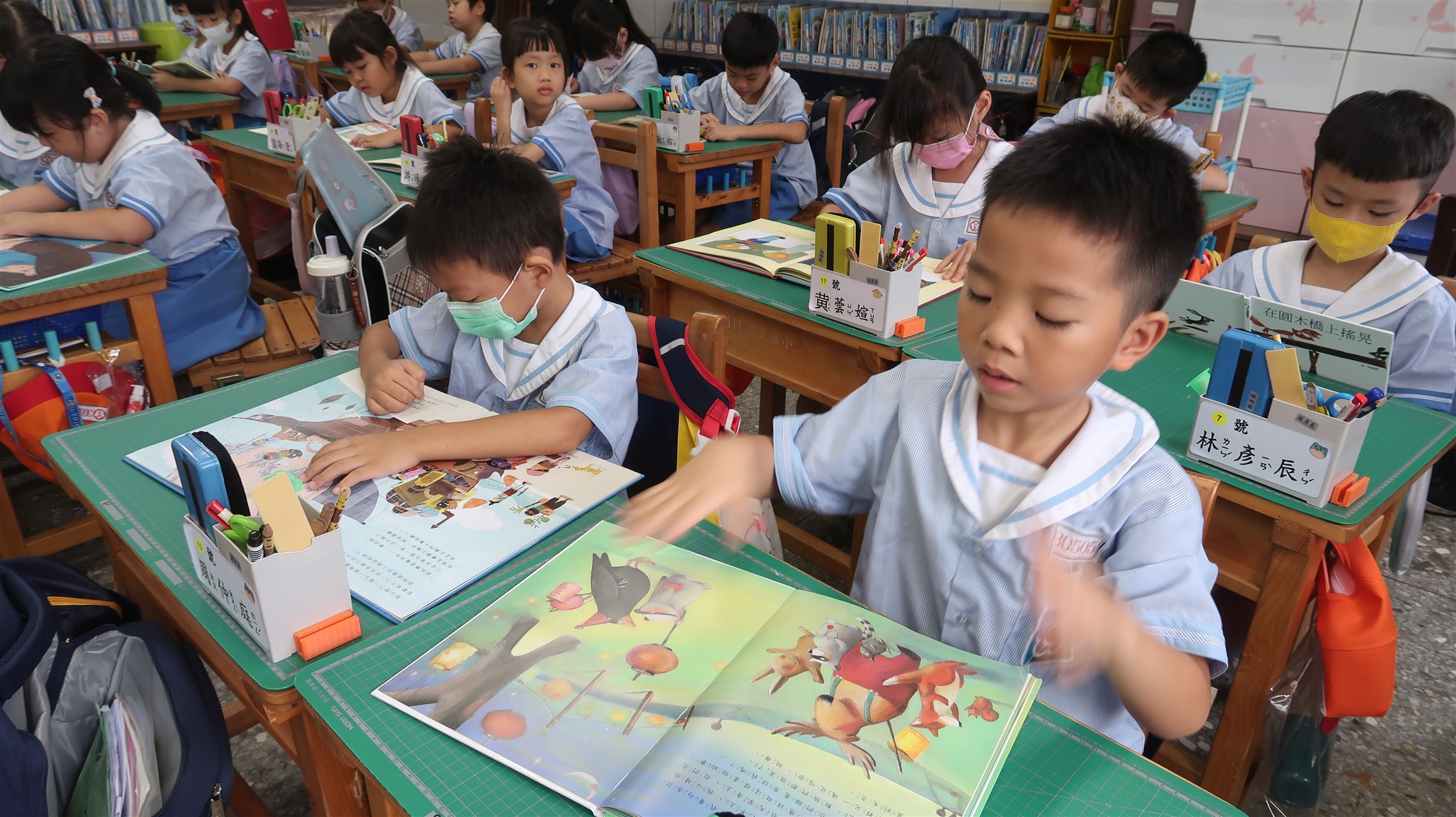 二、豐富的閱讀材料。每學期由圖書老師為數個學年組織班級書箱,裡頭擺放不同種類、符合該學齡適讀的書籍,也會兼顧每班孩子閱讀程度的差異,組合不同層次的書,例如:三年級書箱多為橋梁書;四年級進入兒童小說:高年級書箱以少年小說為主。越高年級書箱內的書籍類別也愈豐富,例如四年級會加入更多科普書籍、知識型漫畫:高年級則是有更多中外史地類叢書,也會加入社會科學類和藝術類書籍。另外,也有班級申請讀報計畫,將國語日報納入閱讀材料,增加閱讀的多樣性。