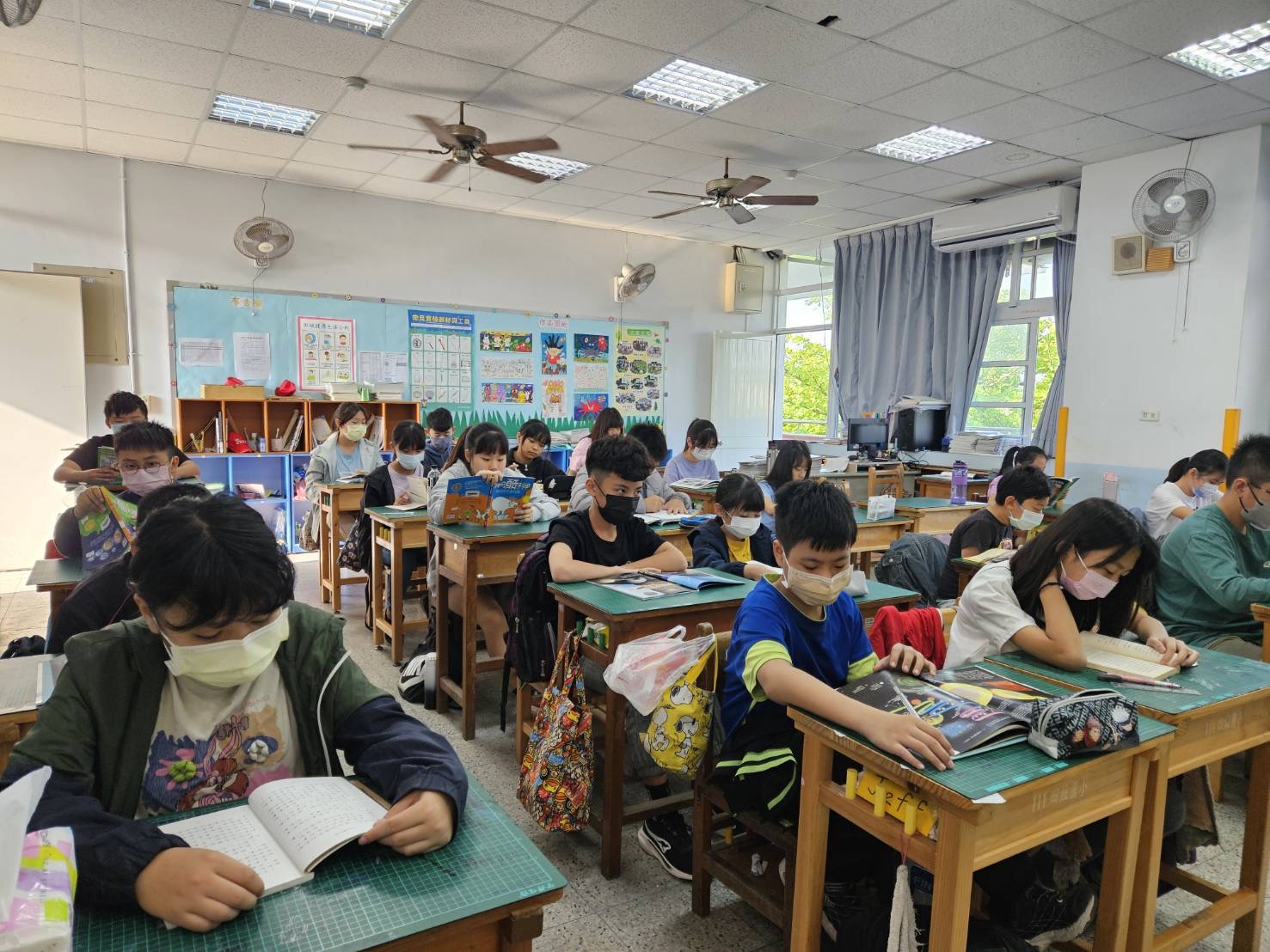 每週三早上8:10~8:30晨讀時間只要廣播播放起輕柔的音樂,全校師生便會自動在座位上安靜的閱讀,沉浸於書香之中。本校結合導師和圖書志工的力量,配合各年級各領域的學習主題,挑選適合的書本建置各班班級書箱圖書共三十冊,於晨讀時間閱讀使用。各班老師也精心準備了班級圖書供學生就近閱讀,讓學生在晨讀時間接觸各類型文本,培養主動閱讀、喜愛閱讀的態度。