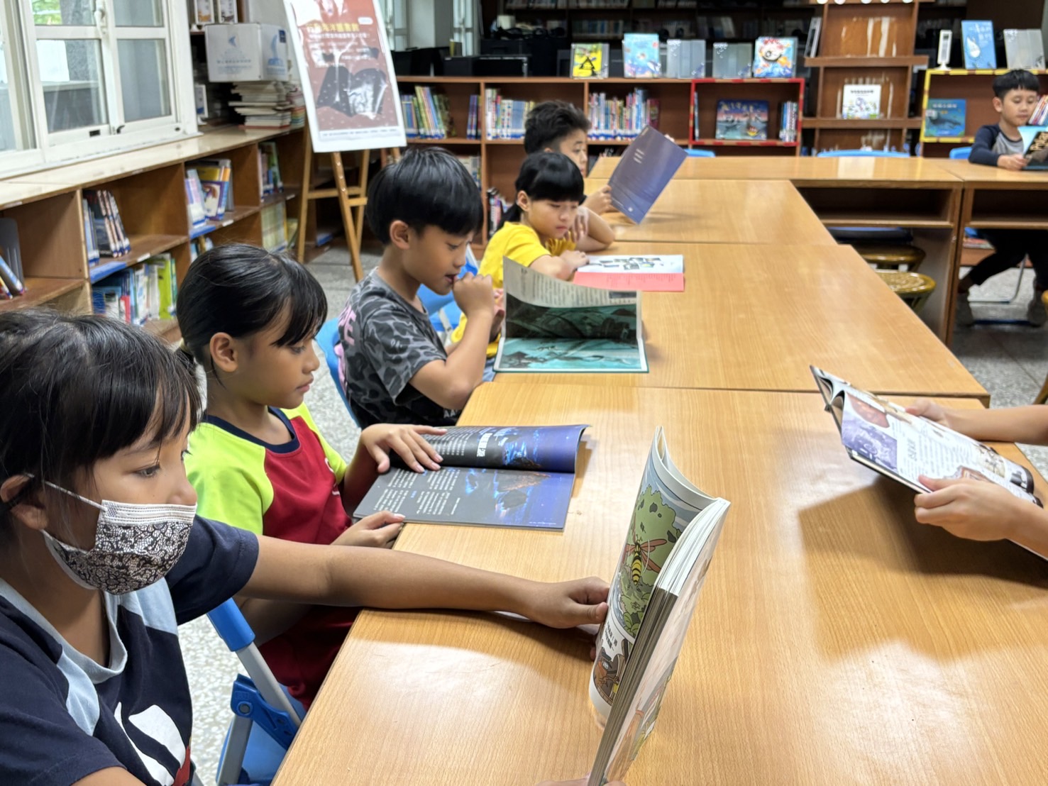 3.海洋行動圖書館:與海洋生物博物館合作,由海生館挑選適合學童閱讀之海洋相關圖書及繪本等,也包含了海生館自行出版之書籍,以行動書箱形式將書送至學校閱覽室展出,各班導師也依據任課的科目及課程內容,結合海洋主題,帶學生至展示區閱讀相關書籍。