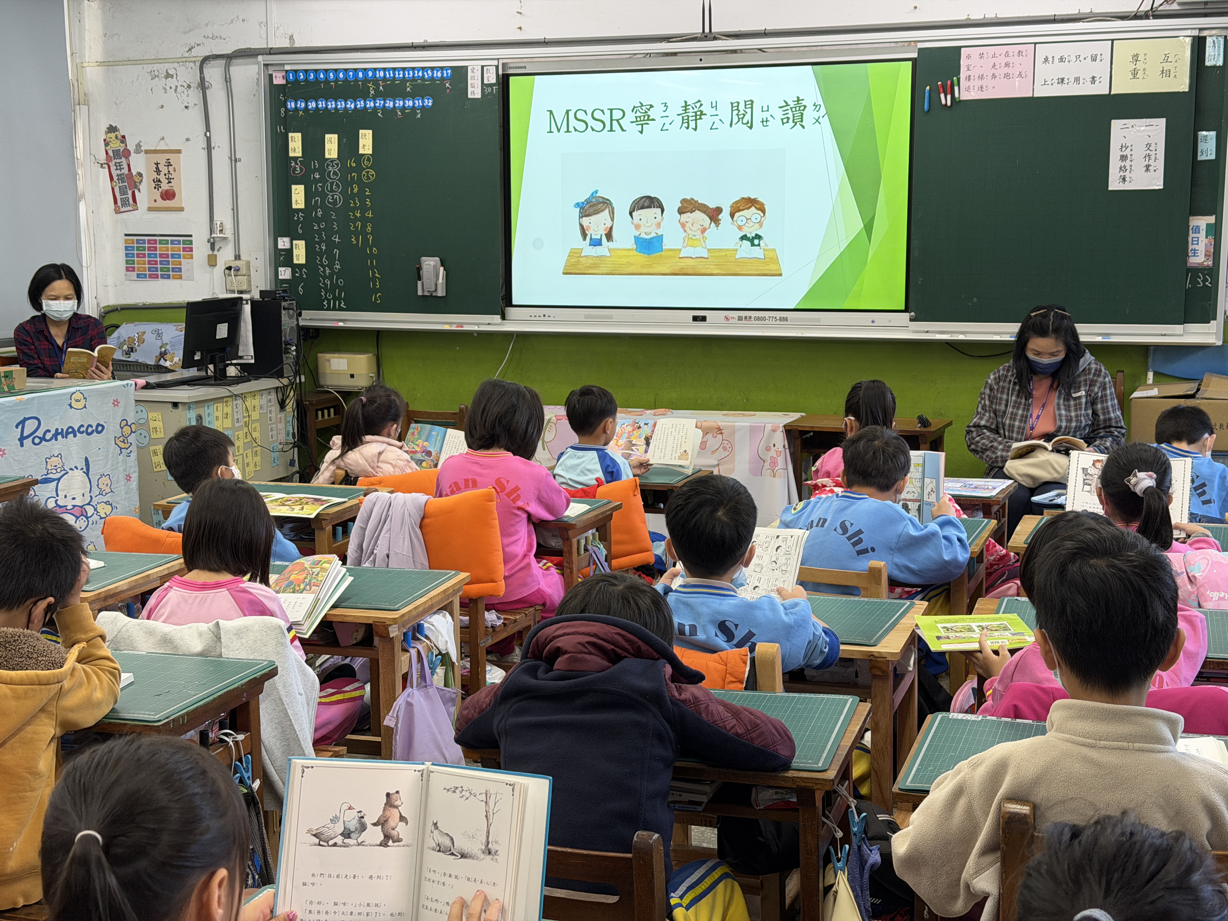 全校每週固定四次,每次十分鐘,全體師生共同進行MSSR閱讀活動。校長與行政團隊、家長亦入班共讀,以身作則,展現「身教式閱讀」的精神。教師、家長與學生同在書香中靜心沉澱,營造溫暖而專注的閱讀氛圍,讓閱讀成為校園生活的自然節奏。