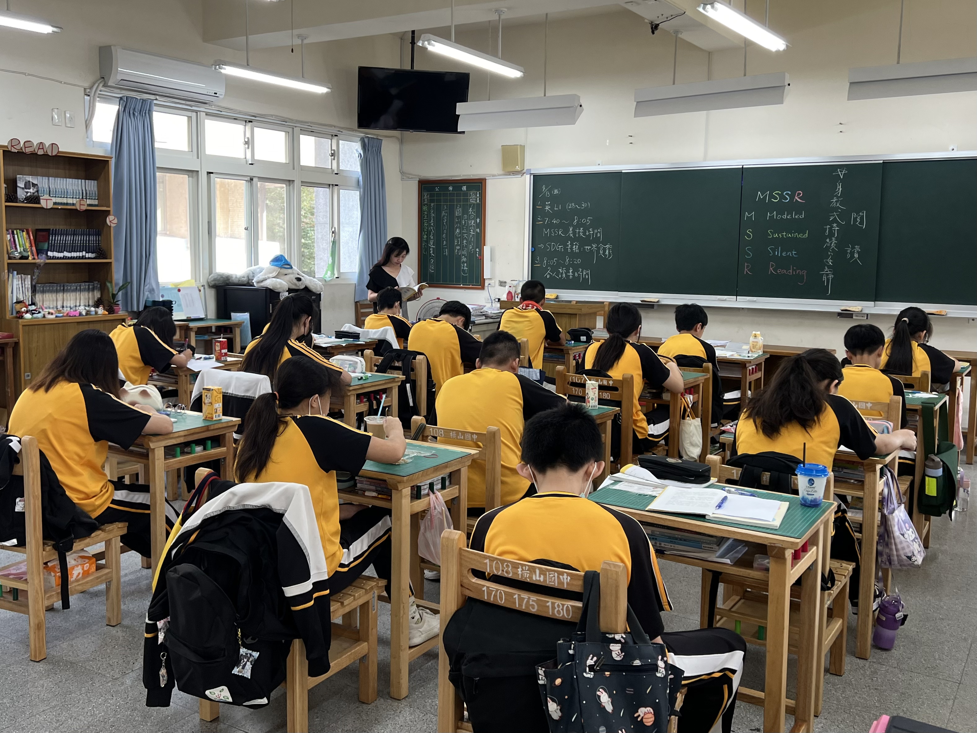 橫山國中每周五早自習時間的晨讀時光,由導師帶領班級進行MSSR,導師坐於教室前方,在教室寧靜的閱讀環境中,作為學生的閱讀典範,帶領學生持續、安靜的閱讀,學生能夠共讀箱書、閱讀自己挑選的書籍,或是使用平板閱讀電子書。透過MSSR,以孩子為主體,將自發、互動、共好落實於本校閱讀教育。