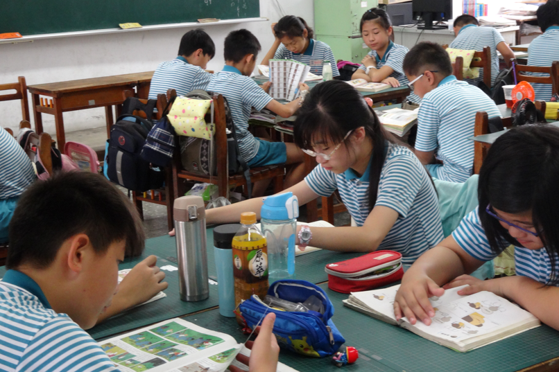 老師以身作則,帶領學生進行晨間閱讀,培養學生的閱讀興趣與習慣。