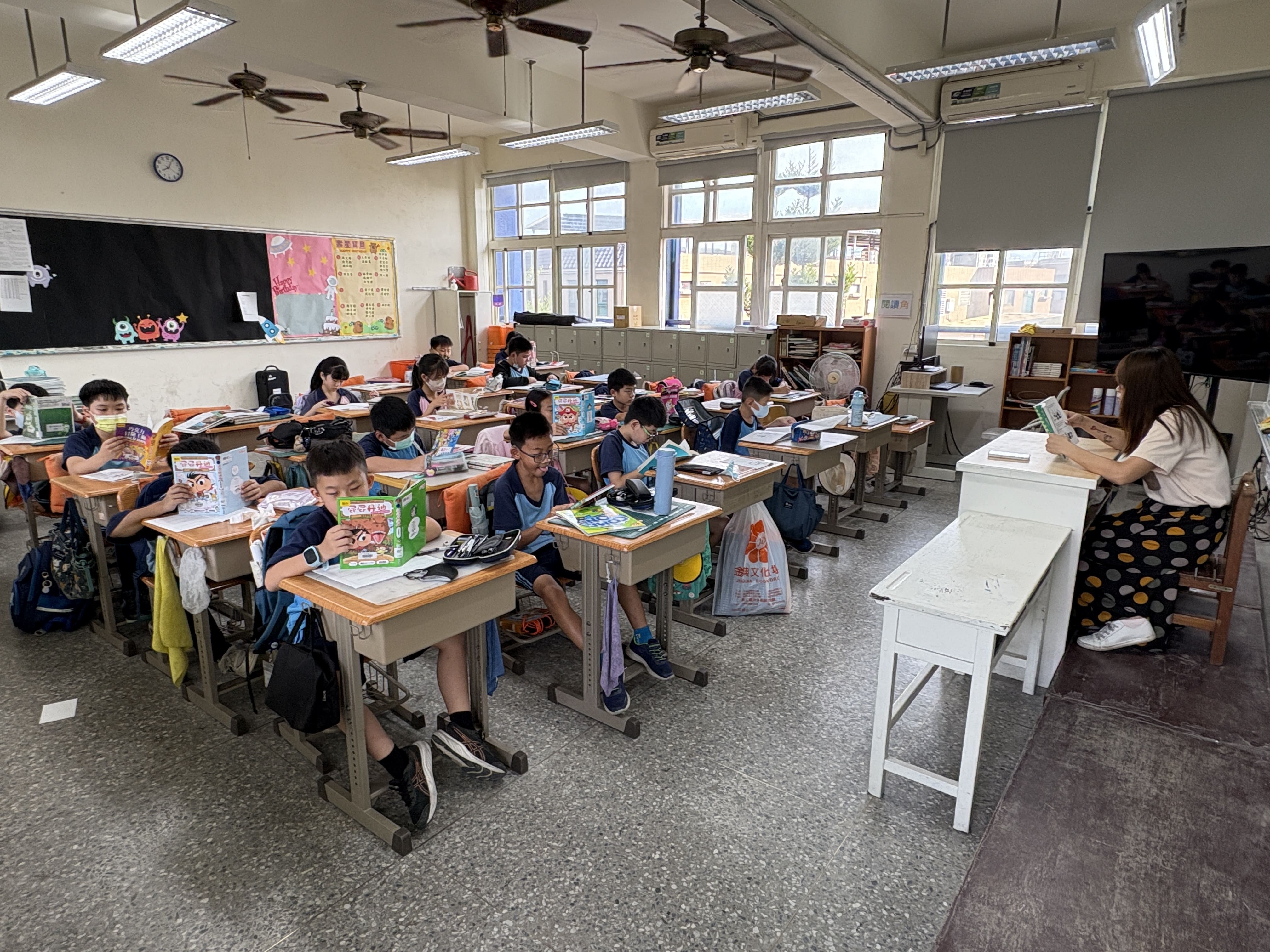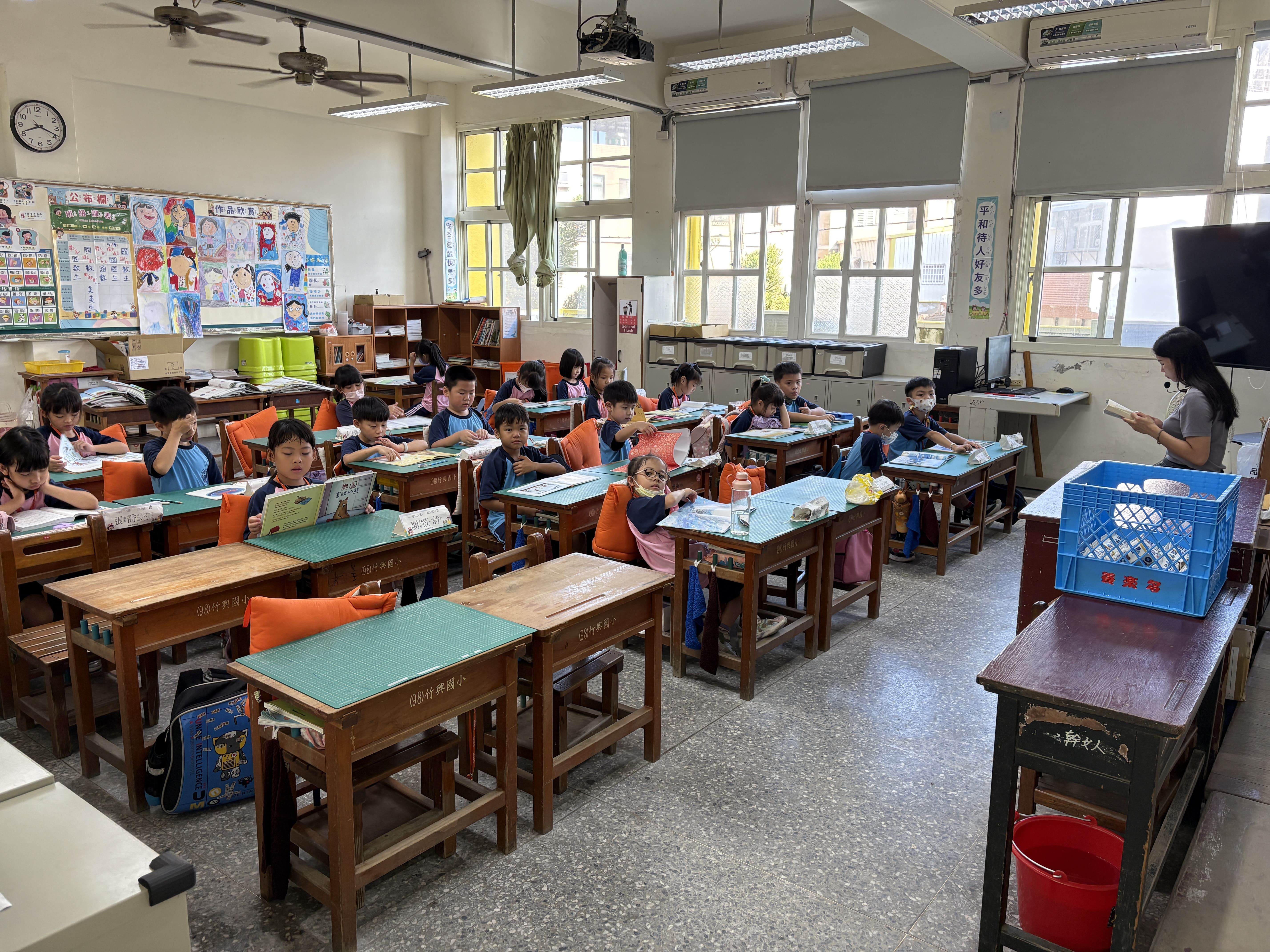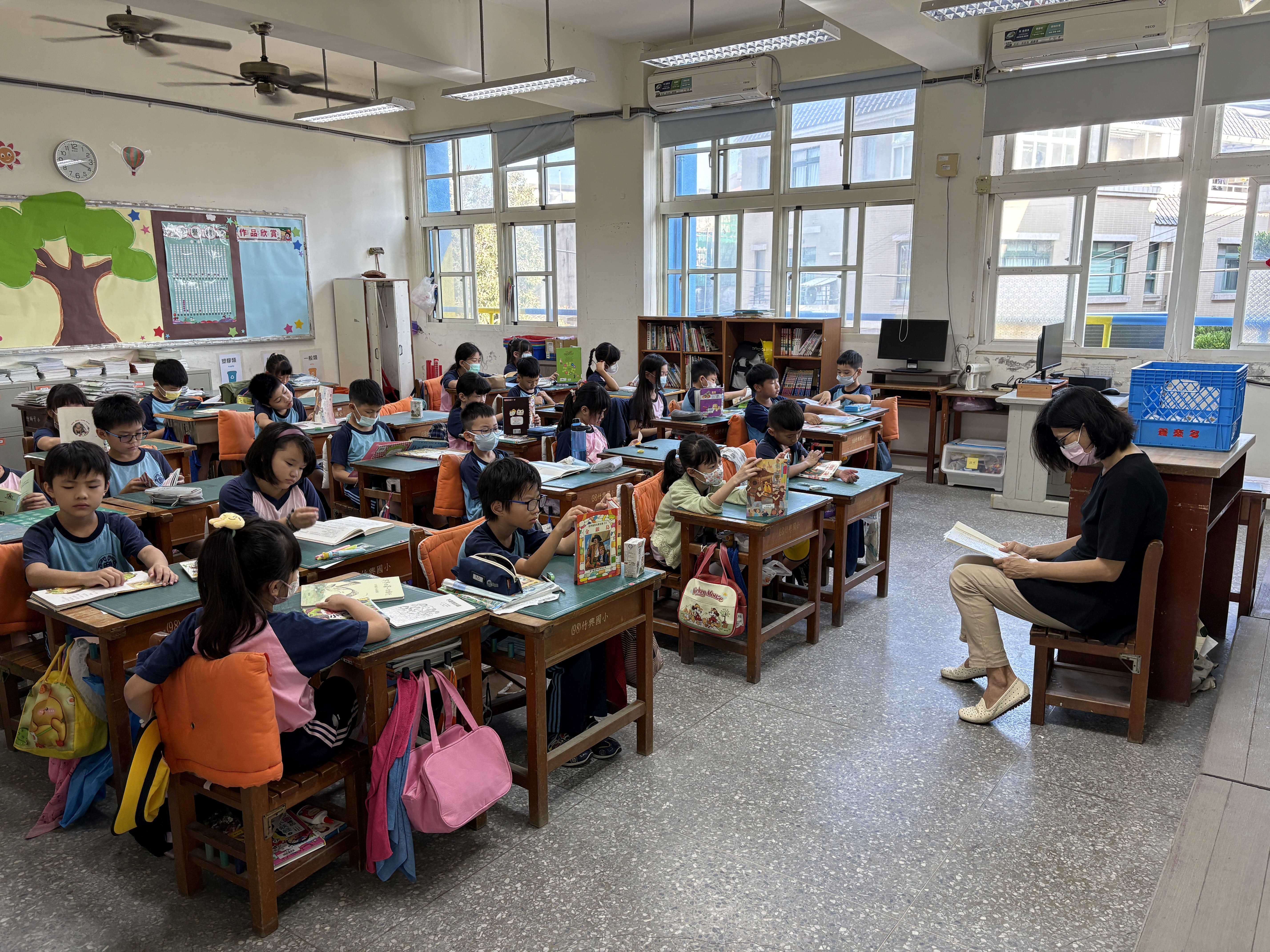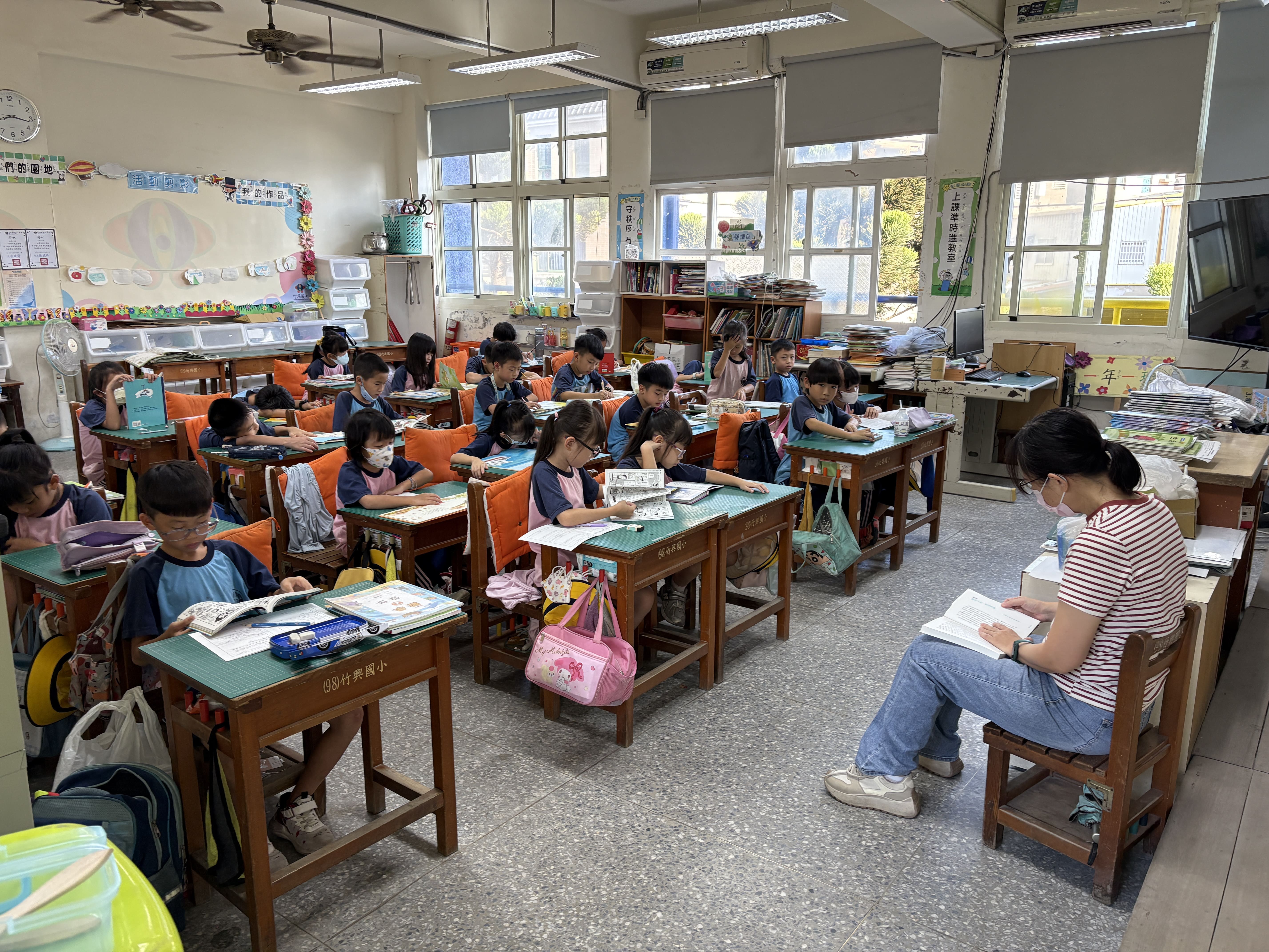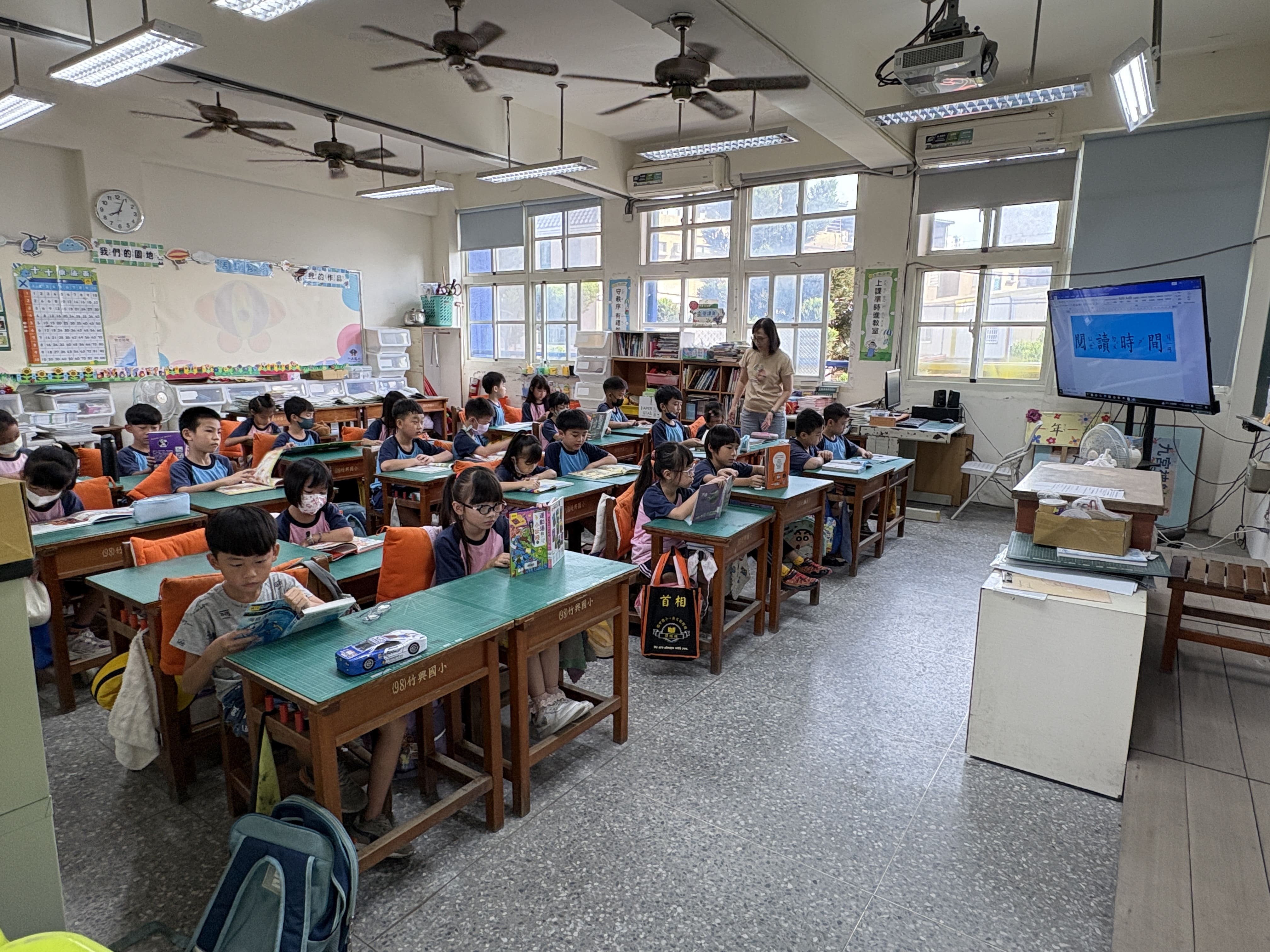 竹興國小每週二早晨安排十五分鐘的晨讀時光,全校師生在輕柔音樂中一同沉浸於閱讀的世界。活動採「身教式持續安靜閱讀」(MSSR)方式進行,教師以身作則,陪伴學生靜心閱讀,讓閱讀成為校園最美的日常風景。學校並結合社區共讀站「臥游書室」的借閱制度與「臥游金榜」表揚活動,鼓勵學生持續借閱與分享閱讀心得。此外,學校推動「小小說書人」活動,讓學生走進其他班級介紹喜愛的書籍,在說書的過程中培養自信與表達能力,也讓閱讀的熱情在全校之間流動。透過教師陪讀與學生分享的雙向互動,竹興國小的晨讀時光成為啟發心靈、連結情感的美好時刻。