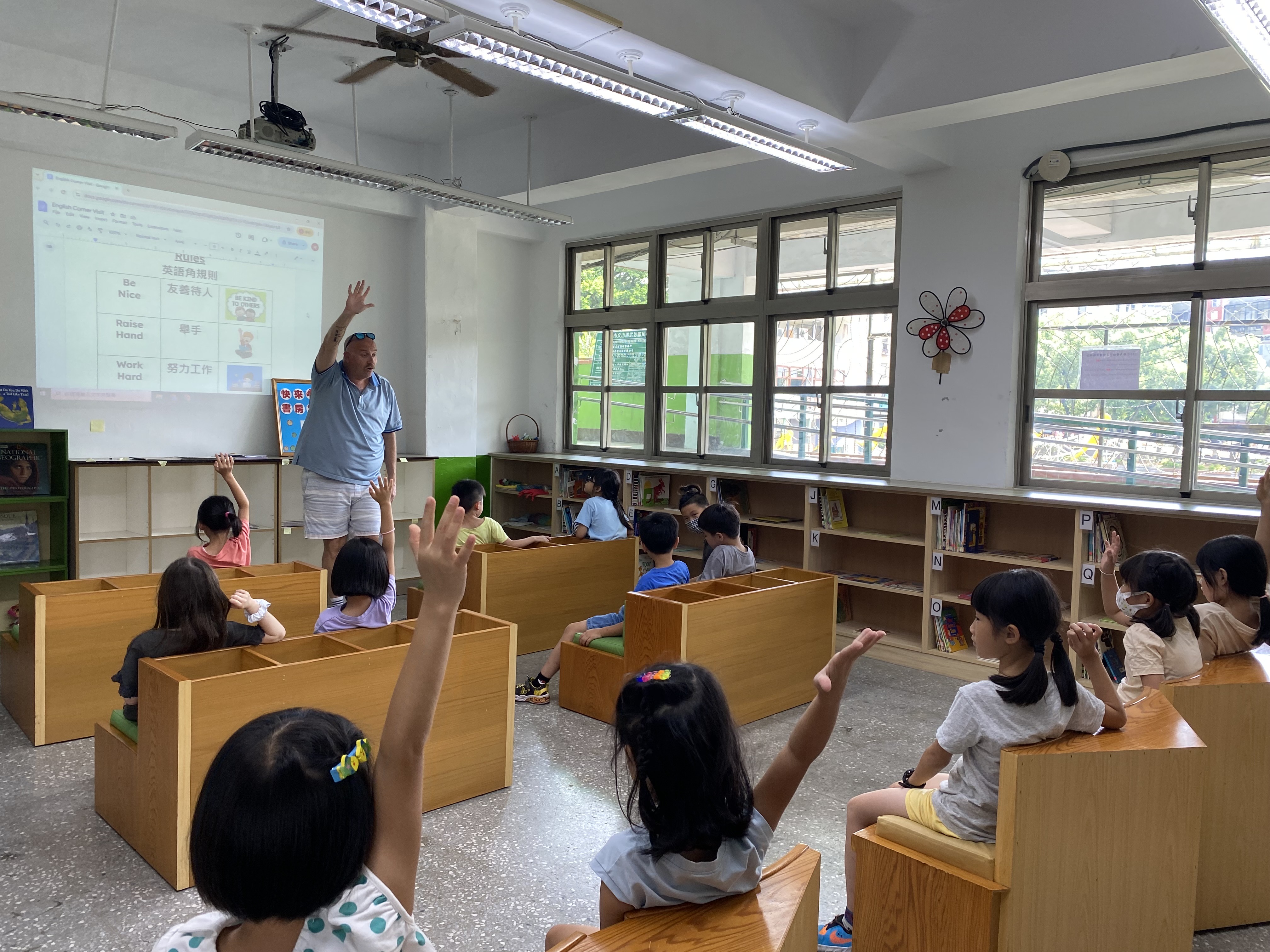 2. 駐校美籍外師說故事:學校安排駐校美籍外師每週一、四於English Corner 為自由參加的學校學生進行說書活動;每學期針對四~六年級入班2次為學生說故事;透過趣味化的英語繪本及動畫故事,增強了學生們對於英文繪本的喜愛及英語口說及聽讀能力。